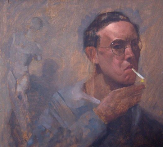 E’ un esperimento giovanile, un po’ accademico, abbozzato, uno studio di quando era allievo di Marchisio, poco più che ventenne. Si atteggia ad uomo, fuma una delle sue prime sigarette, un pretesto per il virtuosismo della fiammella, e del riflesso sugli occhiali. Ancora giovane, dimostra già di voler raccontare una storia nei suoi quadri: è in studio, con indosso un camiciotto da pittore e sul fondo una statuetta anatomica che lo accompagnerà nel corso degli anni, un simbolo del mestiere da affrontare, ed un espressione risoluta, la scelta di un percorso di vita.