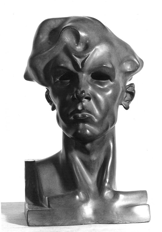 L’immagine che vuole dare di sé diventa più eroica nel ’27, influenzata dal levigato espressionismo dello scultore Adolfo Wildt. È un gesso alto circa 40 cm, che verrà poi fuso in bronzo nel ’72, insieme alle teste di Monet e Marchisio, dove la figura si disincarna, diventa un simbolo, un ideale.